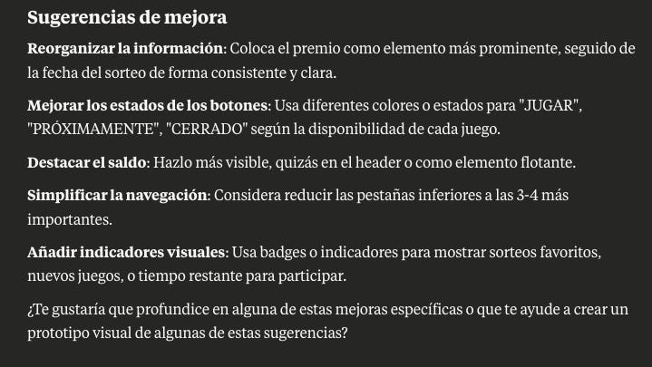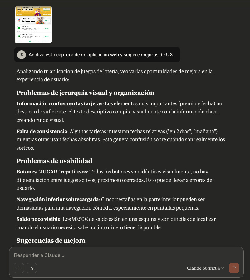 En este caso le he pasado una captura de una aplicación “Tu lotero” y le he dicho en el prompt “Analiza esta captura de mi aplicación y sugiere mejoras de UX”