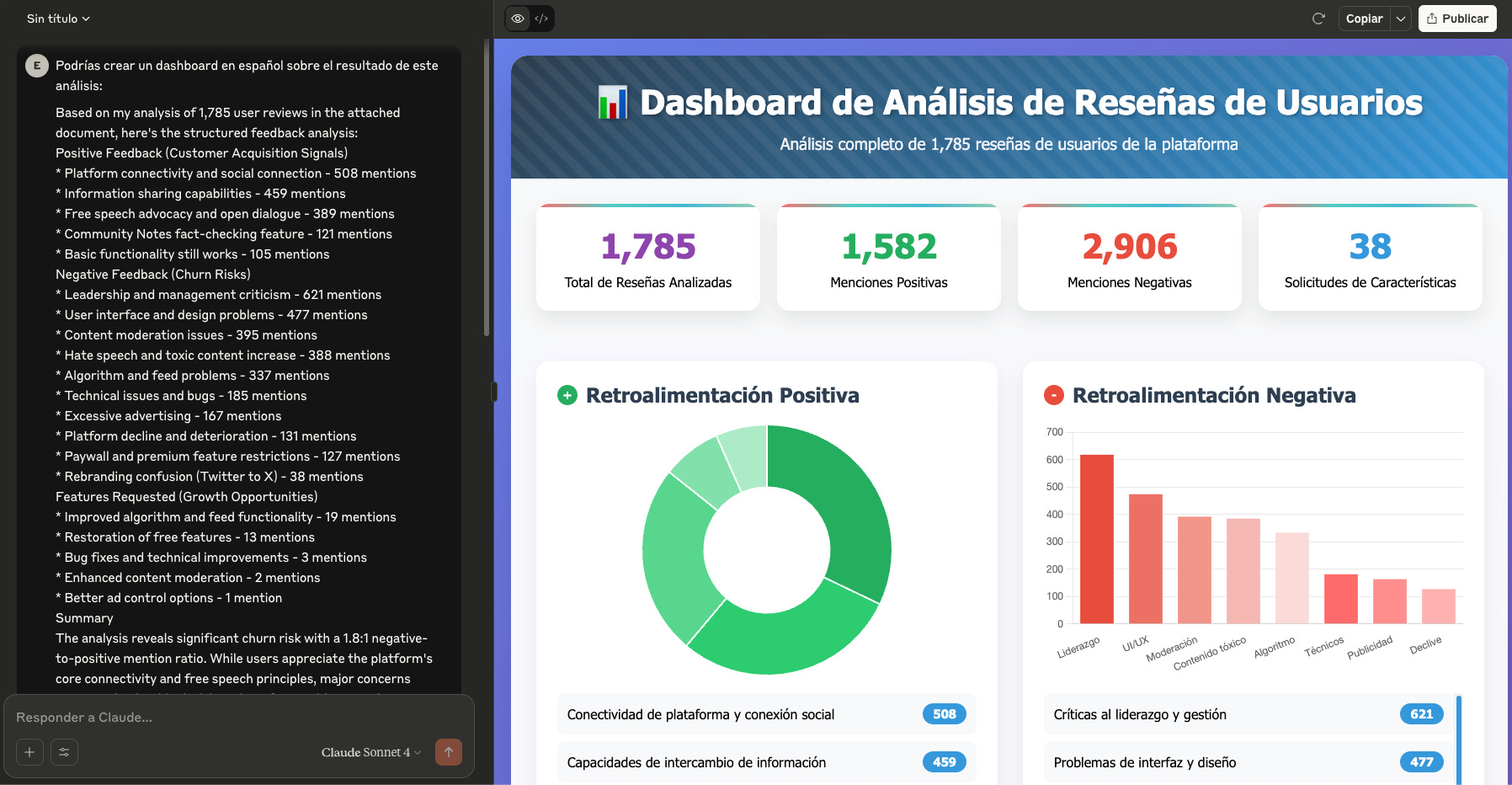 En el siguiente ejemplo le he pedido que me haga un dashboard en base a un análisis que había hecho sobre reseñas de “X”